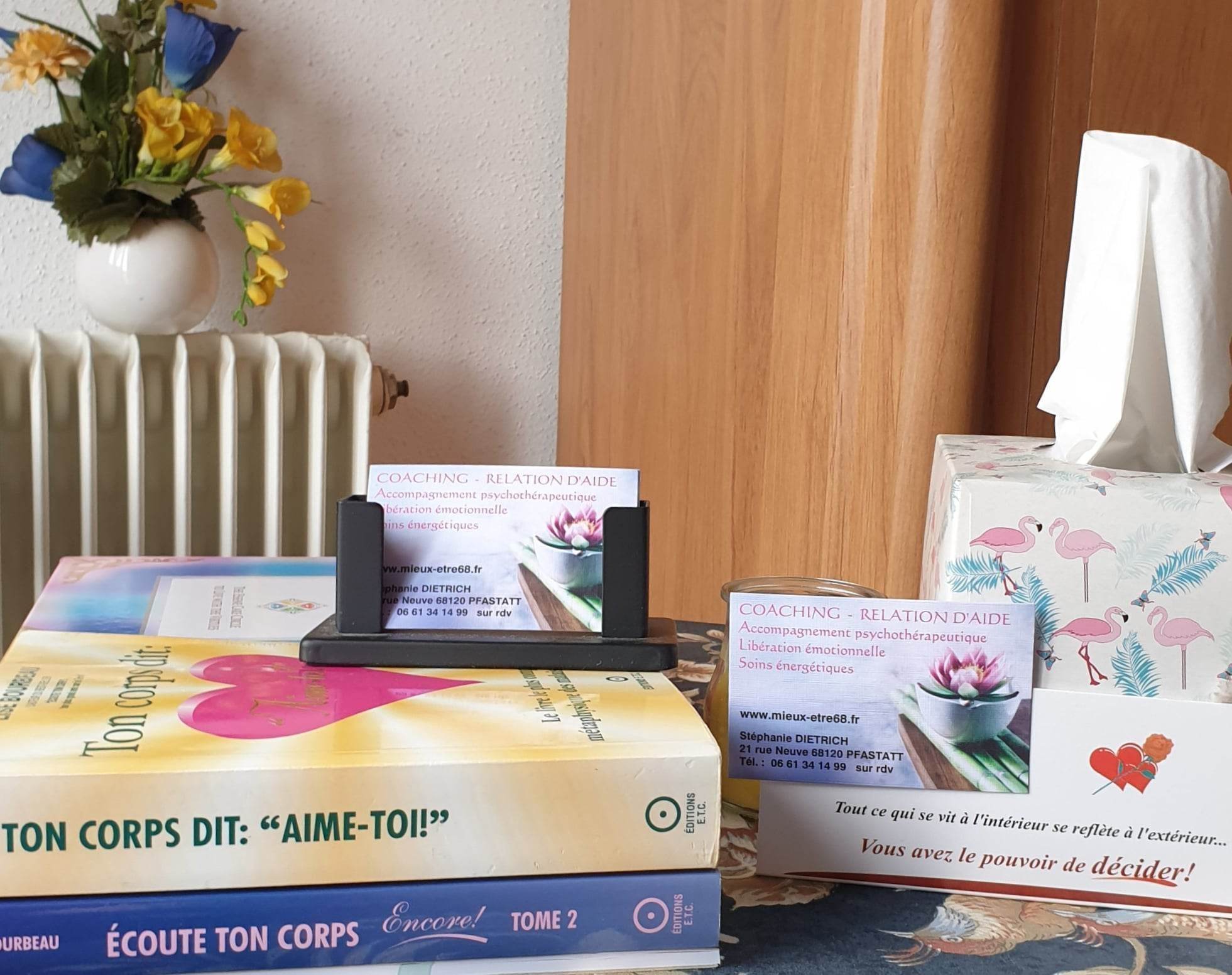 Thérapeute diplômée ÉCOUTE TON CORPS (école de développement personnel fondée par Lise Bourbeau), je suis située à Pfastatt, à côté de Mulhouse dans le Haut-Rhin (68).